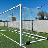 Unlike traditional bulky stadium goals, this model is engineered for practicality. Each goal includes four flat-free wheels, allowing for smooth maneuverability on both natural grass and turf fields. The lightweight aluminum frame features a built-in net channel, making soccer net installation quick, clean, and secure—no lacing required.